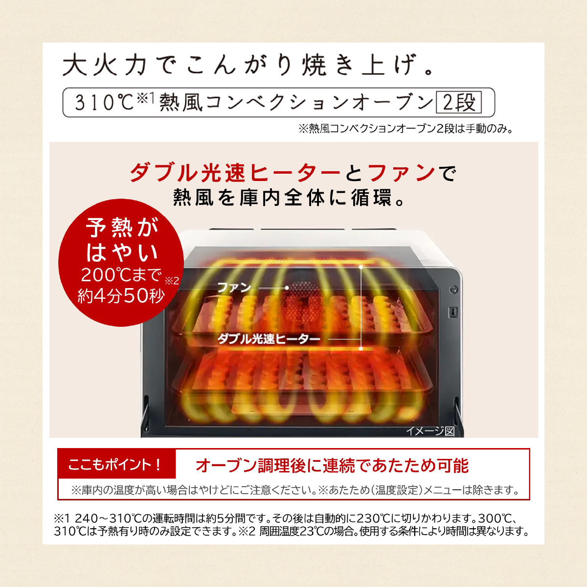 最高310°Cの大火力!熱風コンベクションオーブン(2段)搭載