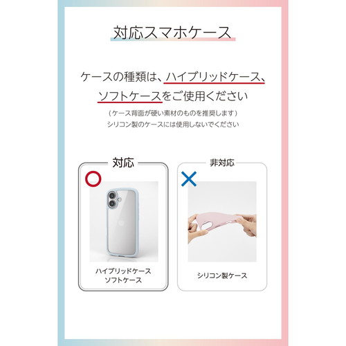 ●※ケースの種類は、ハイブリッドケース、ソフトケースをご使用ください(ケース背面が硬い素材のものを推奨します)。シリコン製のケースには使用しないでください。