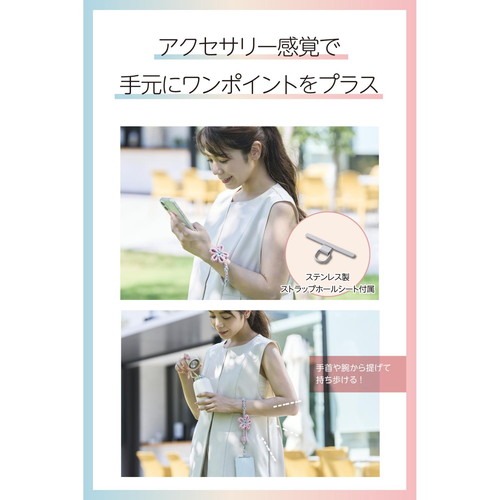 ●ケースにストラップホールがなくても、付属のストラップホールシートをスマートフォンとケースの間に挟むだけで使用でき、取り外しも簡単です。