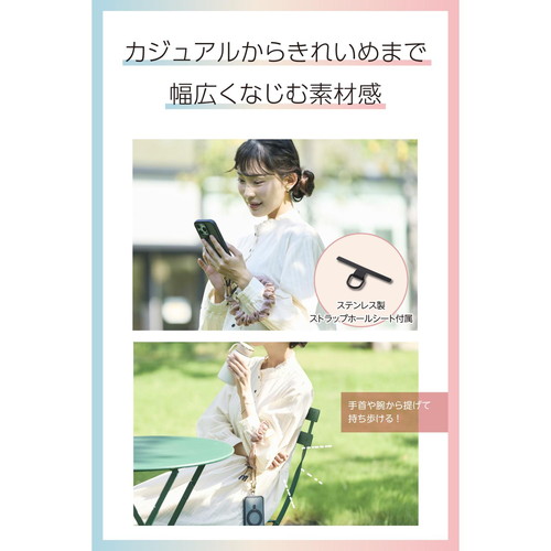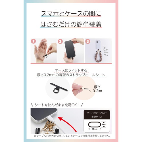 ●ケースにストラップホールがなくても、付属のストラップホールシートをスマートフォンとケースの間に挟むだけで使用でき、取り外しも簡単です。