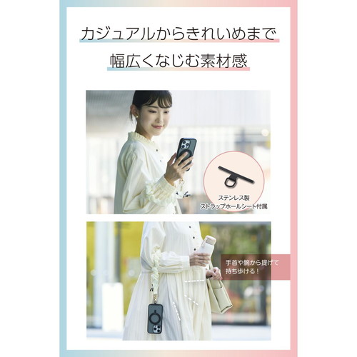 ●ケースにストラップホールがなくても、付属のストラップホールシートをスマートフォンとケースの間に挟むだけで使用でき、取り外しも簡単です。