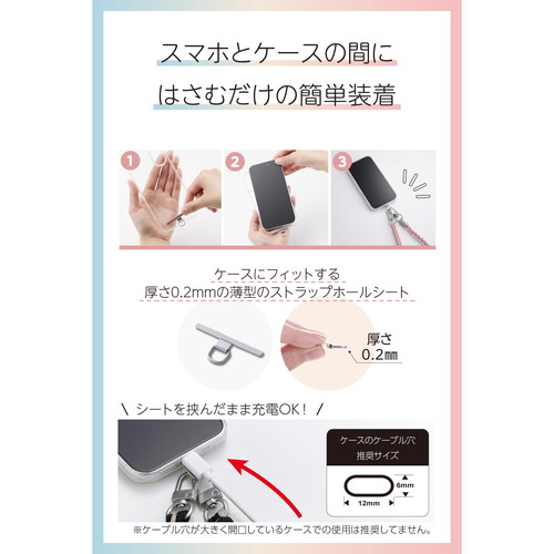 ●ケースにフィットする0.2mmの薄型のストラップホールシートで簡単に装着できます。