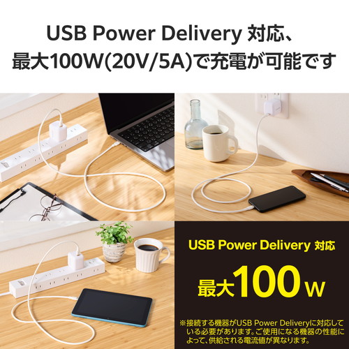 ●USB Power Deliveryに対応し、最大100Wで充電が可能です。スマートフォンやタブレット、パソコンなどに使用できます。