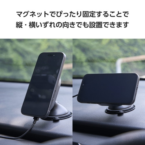 ●マグネットでスマートフォンをぴったり固定することで縦・横いずれの向きでも設置でき、スマートフォンのナビを使いながら充電できます。