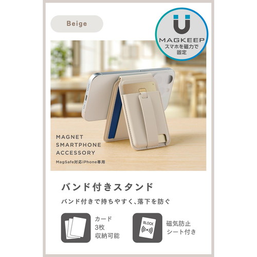 【メール便での発送商品】MagSafe カードケース スタンド iPhone用 磁気防止シート付 3枚収納 マット素材 バンド付 MAGKEEP ブラック