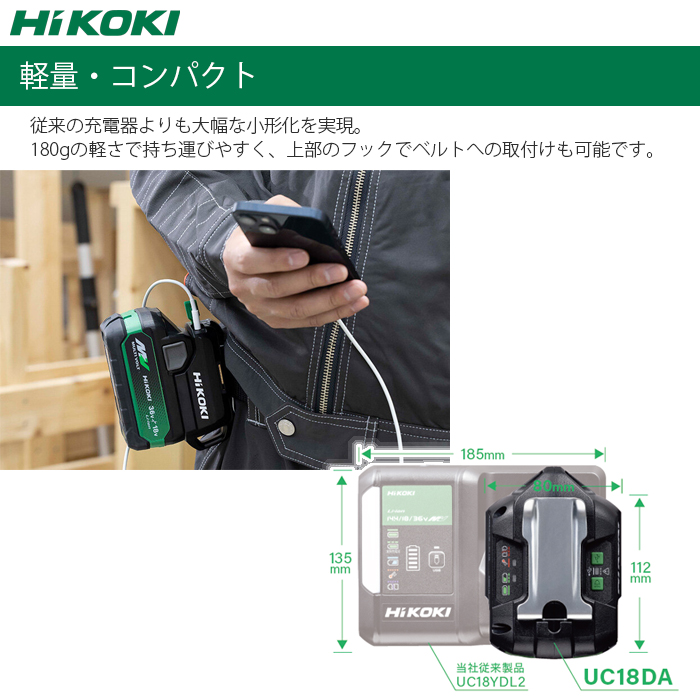 ●従来の充電器よりも大幅な小形化を実現。180gの超小形サイズで持ち運びやすく、上部のフックでベルトへの取り付けも可能です。