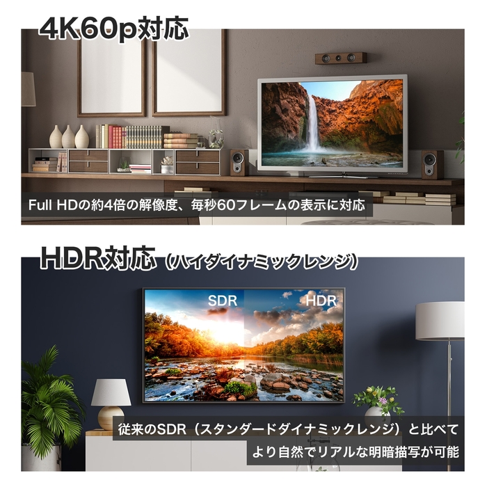 ●18Gbps高速伝送対応 高品質な映像と音声を忠実に伝送します。4K・HDR対応デバイスとの接続に最適なケーブルです。