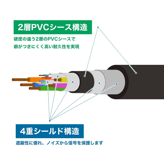●負荷やノイズに強い高耐久ケーブル 硬度の異なる2層のPVCシースを使用することで、癖のつきにくい適度な柔軟性と高い耐久性を実現。 内部には遮蔽性に優れた4重シールド構造を採用しています。