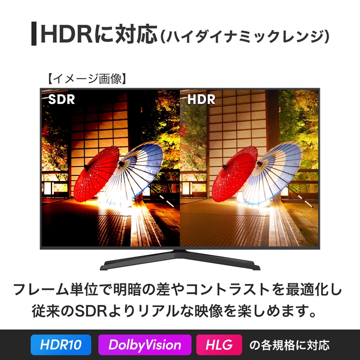 ●HDR(ハイダイナミックレンジ)対応 従来のSDR(スタンダードダイナミックレンジ)に比べ、より自然でリアルな明暗描写が可能です。HDR10、Dolby Vision、HLGの各規格に対応しています。