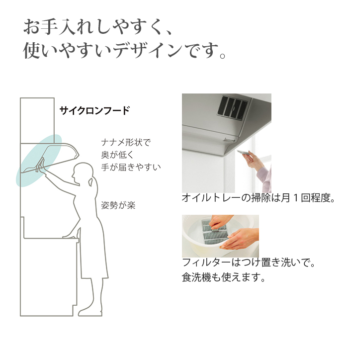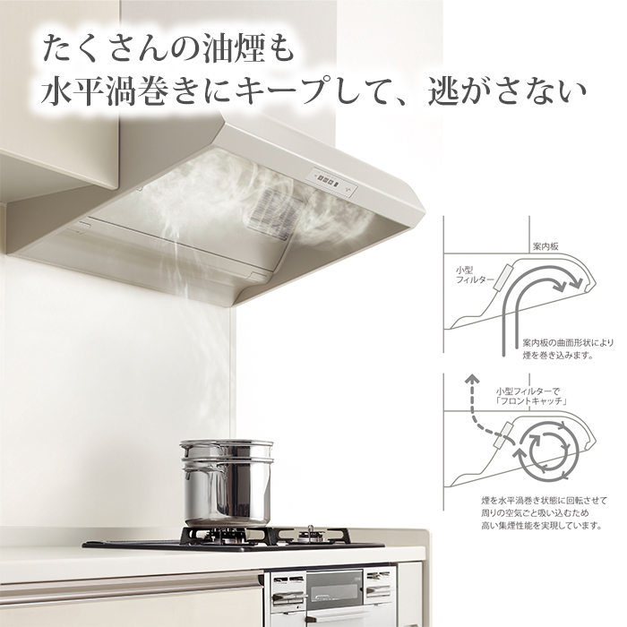 ◆フロントキャッチ方式で油煙を逃がさず、ファンを汚さない