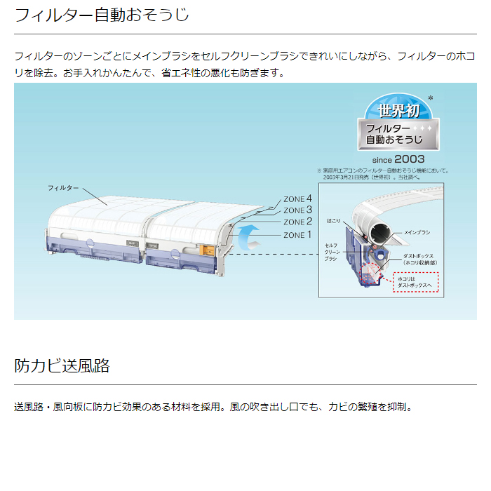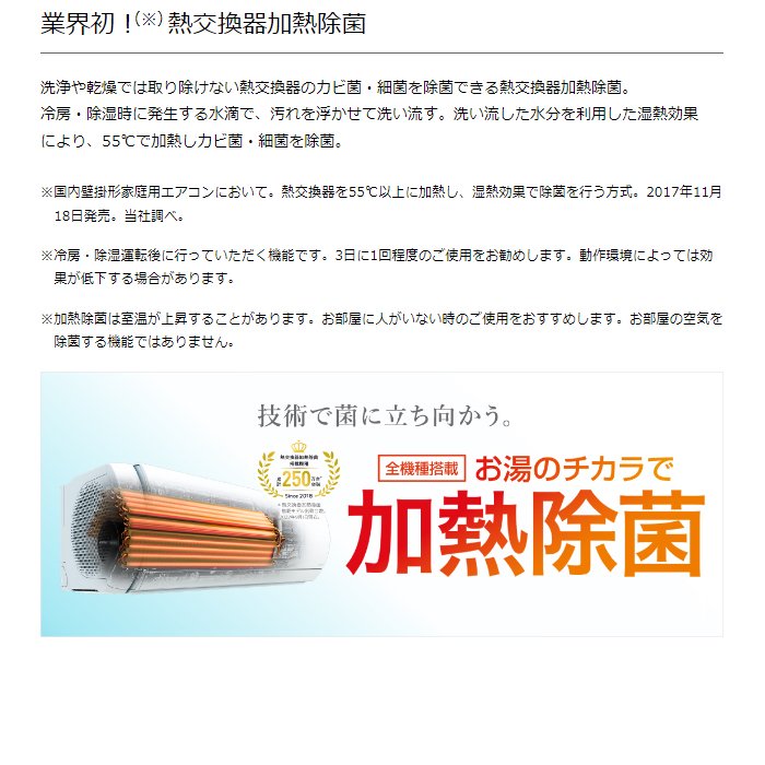 ●内部清潔機能:熱交換器加熱除菌、ハイドロフィリック熱交換器、ウィルカット・フィルター プラス