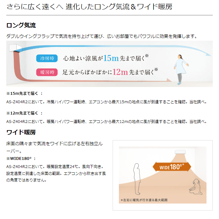 ●さらに広く遠くへ 進化したロング気流&ワイド暖房