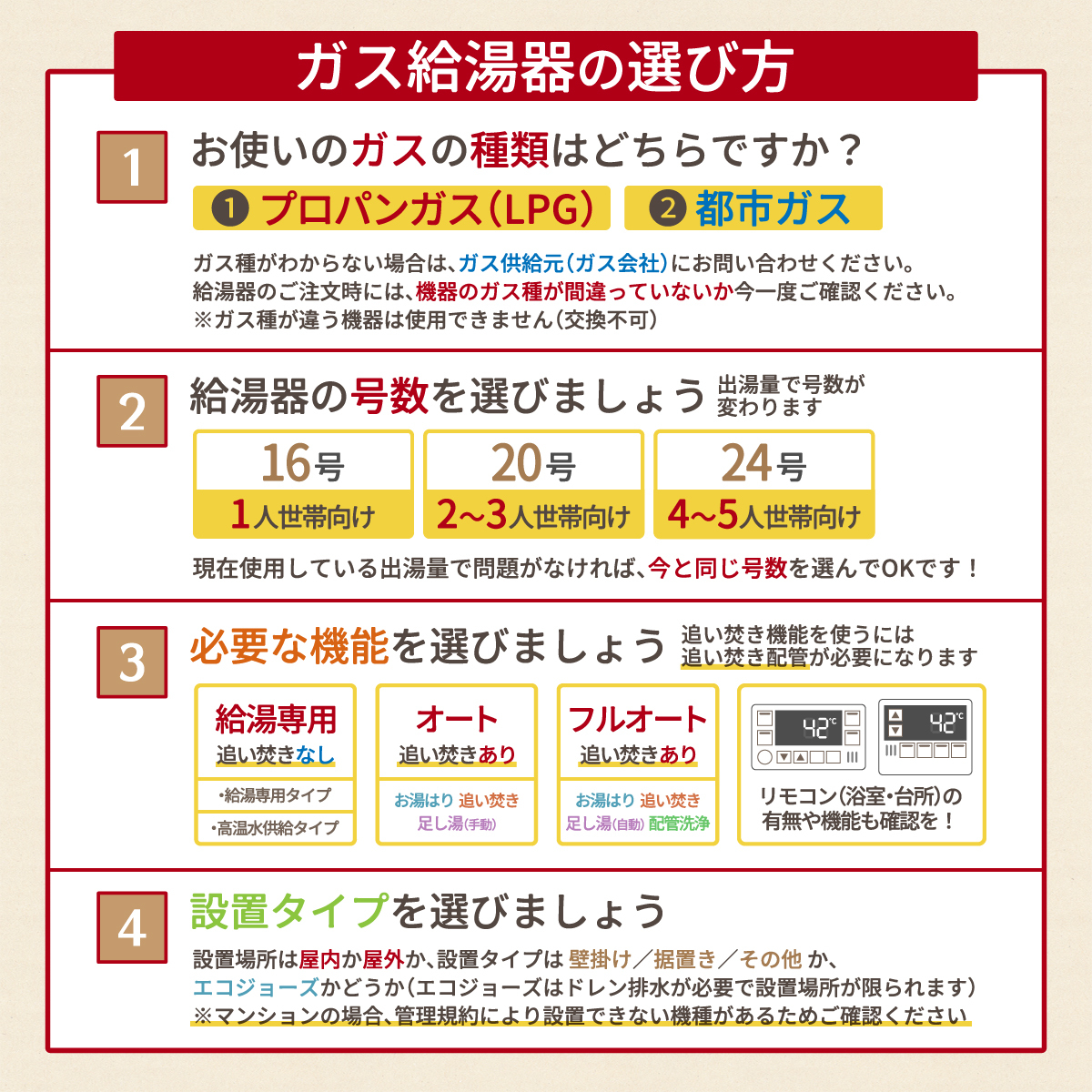 事前に【ガス種】【号数】【設置タイプ】をご確認の上、ご注文をお願いいたします。