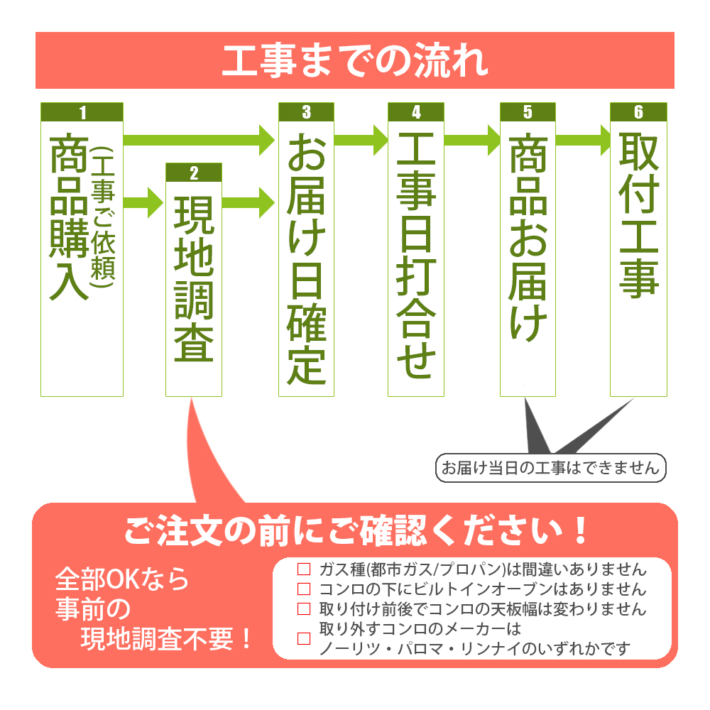 ●2.お届け日・工事日決定:ガスコンロ本体は、運送会社でのお届けのみとなります