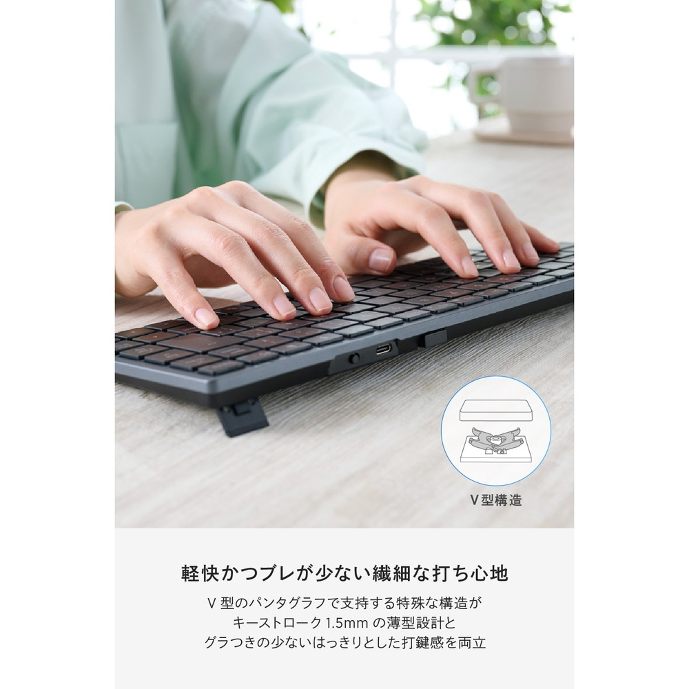 ●V型構造で、軽快かつブレが少ない繊細な打ち心地を実現。キートップをV型のパンタグラフで支持する特殊な構造が、キーストローク1.5mmの薄型設計と、グラつきの少ないはっきりとした打鍵感を両立します。