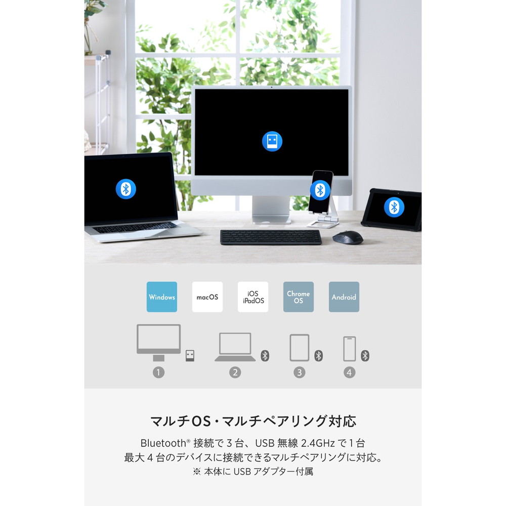 ●複数のデバイスをひとつのキーボードで操作可能。最大4台のデバイスに接続できる、マルチペアリングに対応しています。Bluetooth(R)接続で3台、USB無線2.4GHzで1台まで接続機器を本体に保存でき、使用シーンに合わせてデバイスを瞬時に切り替えられます。