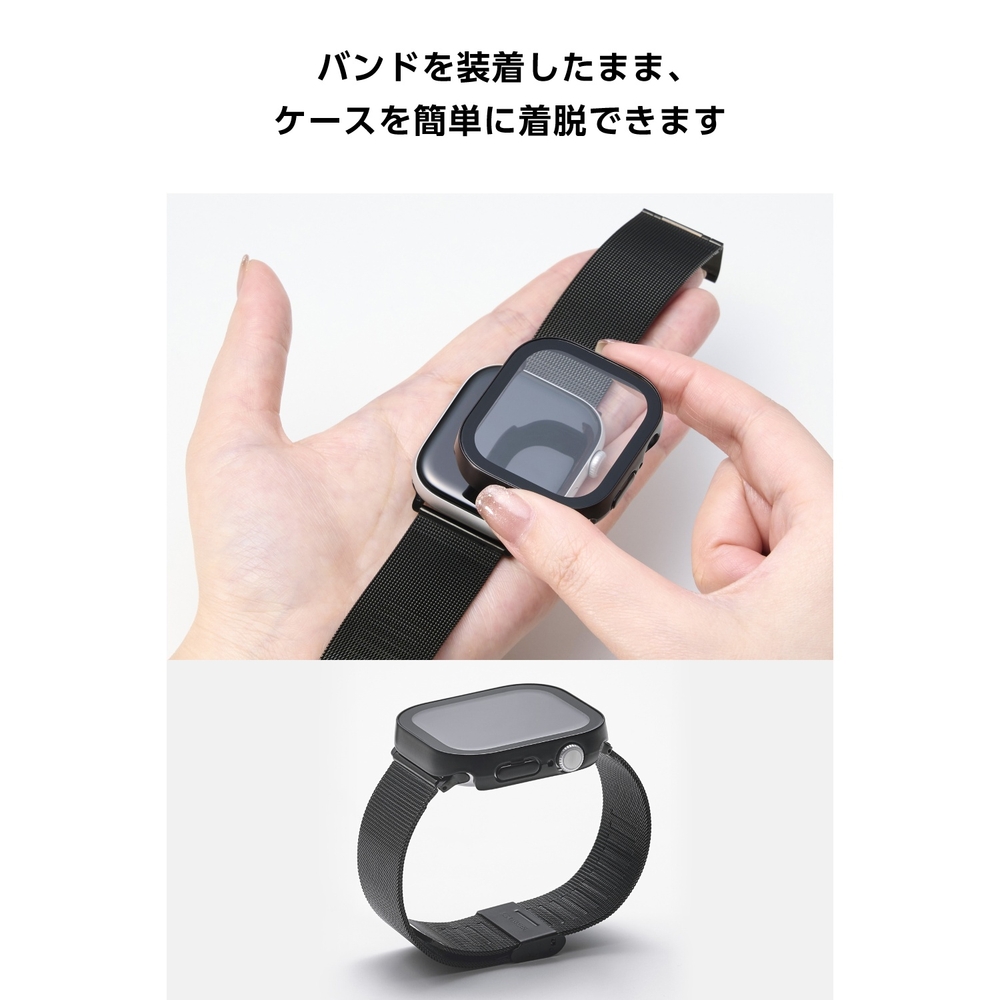 ■JIS保護等級 IPX7相当の防水性能で画面への水の侵入を防ぎ、端末を傷や汚れから守るApple Watch用フルカバーケースです。 ■ポリカーボネート素材とガラスの2重構造で、Apple Watchの画面および側面部を保護します。 ■画面には、透明度が高く、傷に強い強化ガラスを採用しています。 ■表面硬度10Hの強化ガラス採用により、保護ガラス表面の傷を防止します。 ■※当社基準による鉛筆硬度試験での実力値です。 ■指紋・皮脂汚れが付きにくく、残った場合でも簡単に拭き取れる指紋防止加工を施しています。 ■特殊な飛散防止設計により、万が一割れてしまった際にもガラス片が飛散することなく、高い安全性を実現しています。 ■薄くて軽く強じんなポリカーボネート素材を使い、側面部を覆うように保護します。 ■バンドが装着されたままでも、ケースを簡単に着脱できます。 ■ケースをApple Watchに装着したままで画面の確認、本体の操作、各種ボタン操作、純正の磁気充電ケーブルへの設置が可能です。