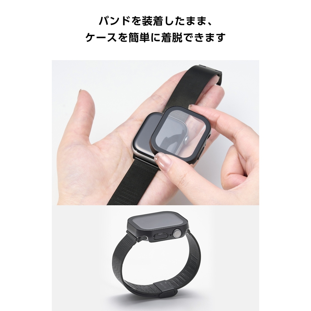 ■JIS保護等級 IPX7相当の防水性能で画面への水の侵入を防ぎ、端末を傷や汚れから守るApple Watch用フルカバーケースです。 ■ポリカーボネート素材とガラスの2重構造で、Apple Watchの画面および側面部を保護します。 ■画面には、透明度が高く、傷に強い強化ガラスを採用しています。 ■表面硬度10Hの強化ガラス採用により、保護ガラス表面の傷を防止します。 ■※当社基準による鉛筆硬度試験での実力値です。 ■指紋・皮脂汚れが付きにくく、残った場合でも簡単に拭き取れる指紋防止加工を施しています。 ■特殊な飛散防止設計により、万が一割れてしまった際にもガラス片が飛散することなく、高い安全性を実現しています。 ■薄くて軽く強じんなポリカーボネート素材を使い、側面部を覆うように保護します。 ■バンドが装着されたままでも、ケースを簡単に着脱できます。 ■ケースをApple Watchに装着したままで画面の確認、本体の操作、各種ボタン操作、純正の磁気充電ケーブルへの設置が可能です。