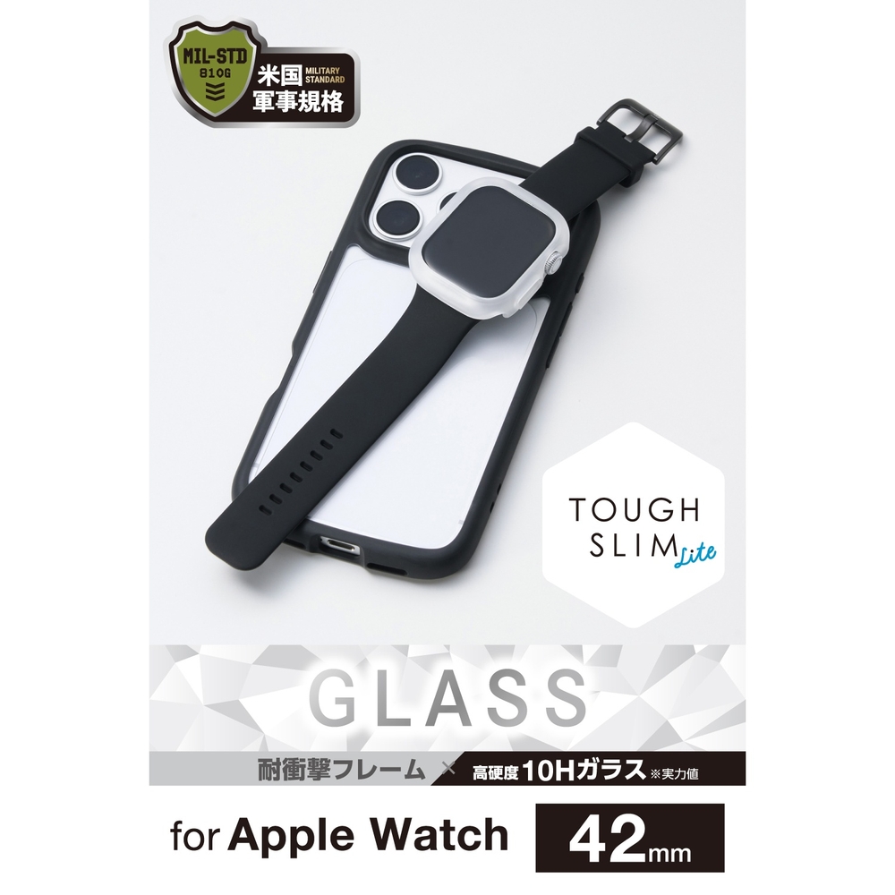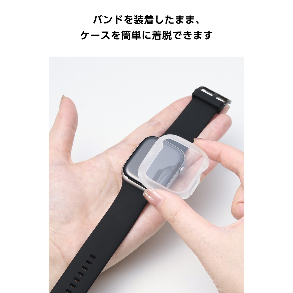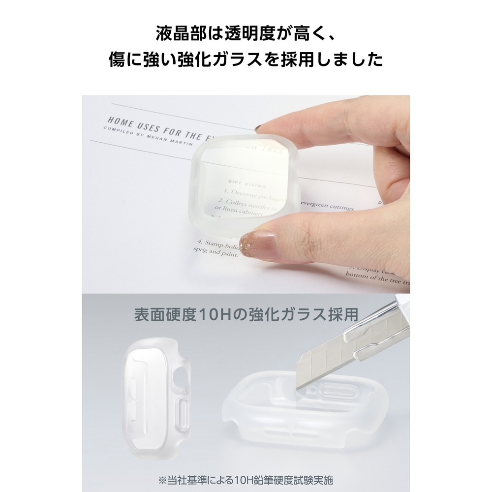 ■画面の視認性に優れる高透明ガラスと、端末本来のデザインを美しく引き立てる透明でしなやかな弾力性のあるTPU(熱可塑性ポリウレタン)樹脂により、端末を傷や汚れから守るApple Watch用TOUGH SLIM LITEケースです。 ■TPU(熱可塑性ポリウレタン)素材とガラスの2重構造で、Apple Watchの画面および側面部を保護します。 ■画面保護部には、透明度が高く、傷に強い強化ガラスを採用しています。 ■表面硬度10Hの強化ガラス採用により、保護ガラス表面の傷を防止します。 ■※当社基準による鉛筆硬度試験での実力値です。 ■指紋・皮脂汚れが付きにくく、残った場合でも簡単に拭き取れる指紋防止加工を施しています。 ■特殊な飛散防止設計により、万が一割れてしまった際にもガラス片が飛散することなく、高い安全性を実現しています。 ■耐久性に優れ、しなやかな弾力性のあるTPU(熱可塑性ポリウレタン)素材を使い、側面部を覆うように保護します。 ■バンドが装着されたままでも、ケースを簡単に着脱できます。 ■ケースをApple Watchに装着したままで画面の確認、本体の操作、各種ボタン操作、純正の磁気充電ケーブルへの設置が可能です。 ■MIL規格に準拠した1.22mからの落下テストをクリアしています(ただし、全ての状態において無破損・無故障を保証するものではありません)。