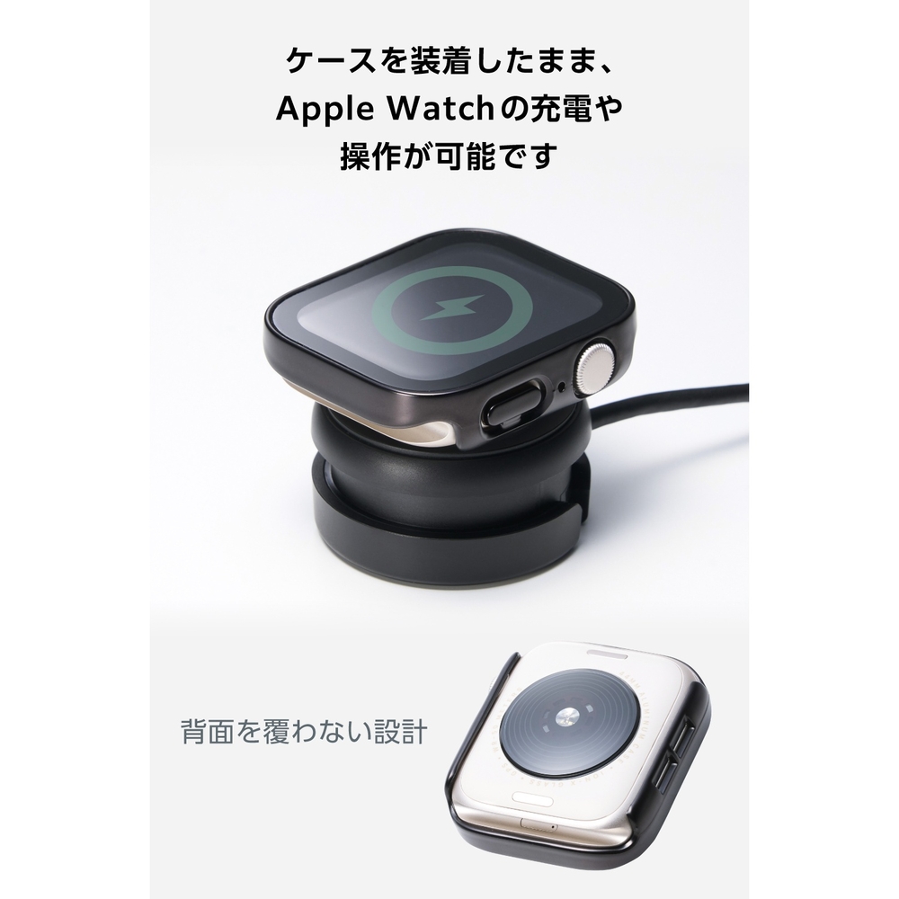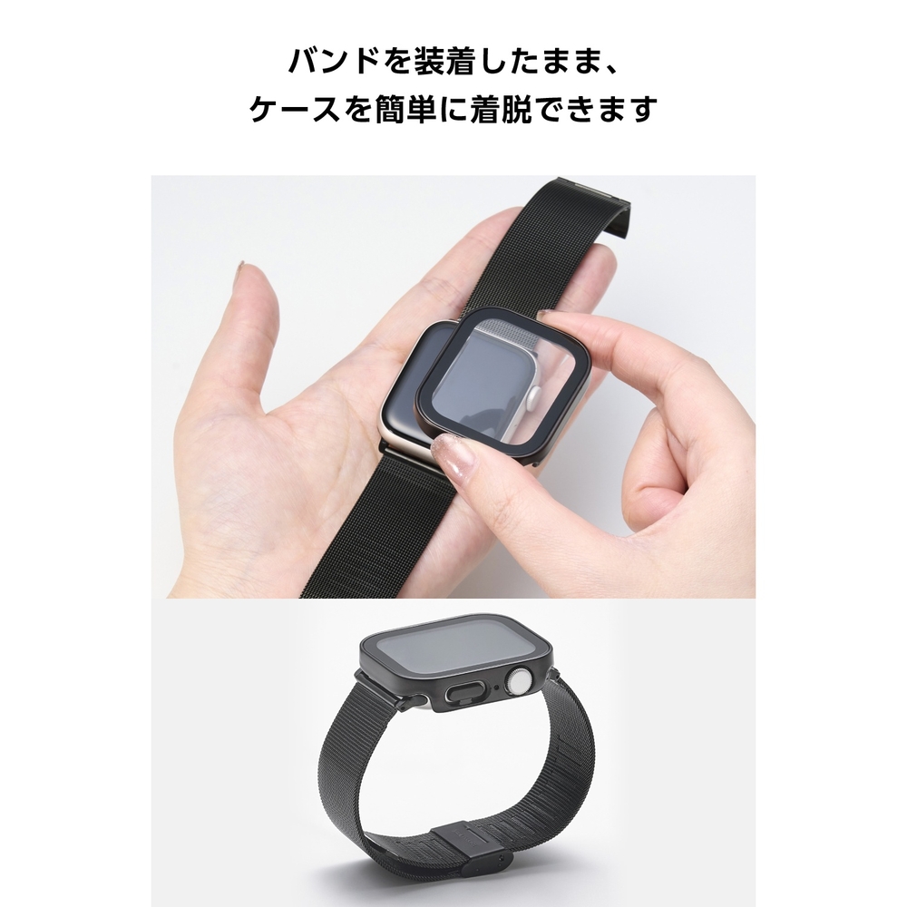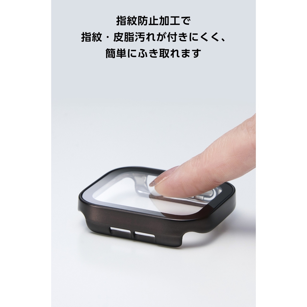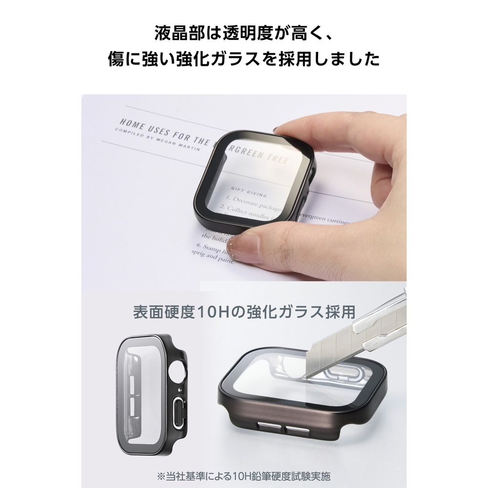■JIS保護等級 IPX7相当の防水性能で画面への水の侵入を防ぎ、端末を傷や汚れから守るApple Watch用フルカバーケースです。 ■ポリカーボネート素材とガラスの2重構造で、Apple Watchの画面および側面部を保護します。 ■画面には、透明度が高く、傷に強い強化ガラスを採用しています。 ■表面硬度10Hの強化ガラス採用により、保護ガラス表面の傷を防止します。 ■※当社基準による鉛筆硬度試験での実力値です。 ■指紋・皮脂汚れが付きにくく、残った場合でも簡単に拭き取れる指紋防止加工を施しています。 ■特殊な飛散防止設計により、万が一割れてしまった際にもガラス片が飛散することなく、高い安全性を実現しています。 ■薄くて軽く強じんなポリカーボネート素材を使い、側面部を覆うように保護します。 ■バンドが装着されたままでも、ケースを簡単に着脱できます。 ■ケースをApple Watchに装着したままで画面の確認、本体の操作、各種ボタン操作、純正の磁気充電ケーブルへの設置が可能です。