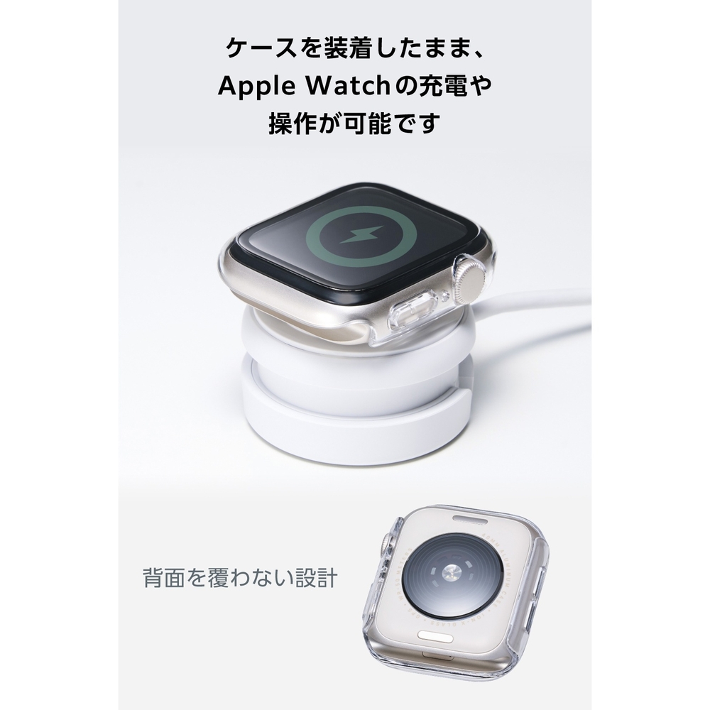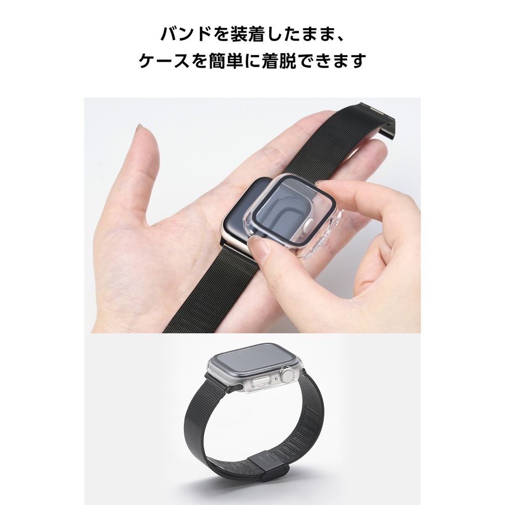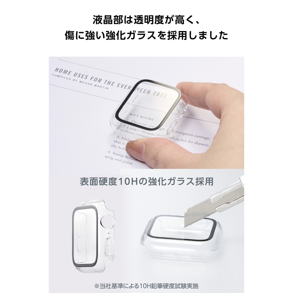 ■画面の視認性に優れる高透明なガラスとポリカーボネート樹脂で、端末を傷や汚れから守るApple Watch用フルカバーケースです。 ■ポリカーボネート素材とガラスの2重構造で、Apple Watchの画面および側面部を保護します。 ■画面保護部には、透明度が高く、傷に強い強化ガラスを採用しています。 ■表面硬度10Hの強化ガラス採用により、保護ガラス表面の傷を防止します。 ■※当社基準による鉛筆硬度試験での実力値です。 ■指紋・皮脂汚れが付きにくく、残った場合でも簡単に拭き取れる指紋防止加工を施しています。 ■特殊な飛散防止設計により、万が一割れてしまった際にもガラス片が飛散することなく、高い安全性を実現しています。 ■薄く、軽く、強じんなポリカーボネートに光沢が美しいUVコートを施し、側面部を覆うようにしっかりと保護します。 ■バンドが装着されたままでも、ケースを簡単に着脱できます。 ■ケースをApple Watchに装着したままで画面の確認、本体の操作、各種ボタン操作、純正の磁気充電ケーブルへの設置が可能です。