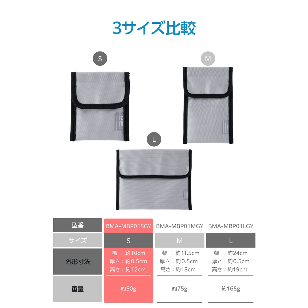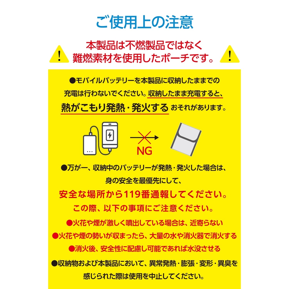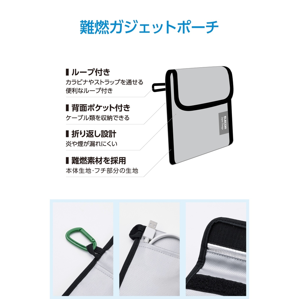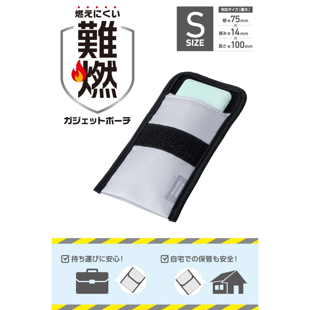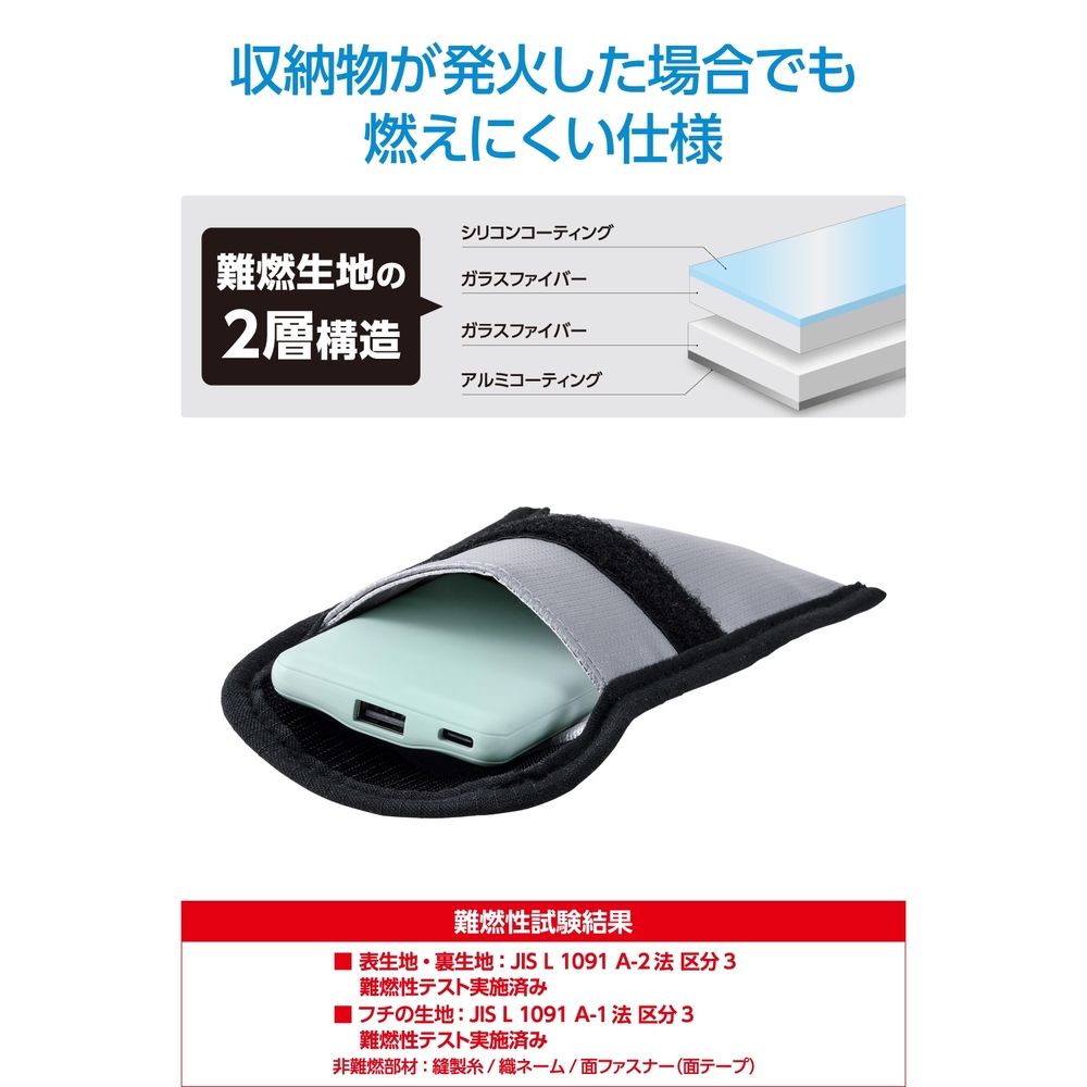 ■難燃性試験をクリアした生地を表と裏で二重に使い、収納物が発火した場合でも燃えにくい仕様です。 ■※本製品は難燃性素材を使用していますが、不燃製品ではありません。 ■入口部分を折って隙間をしっかり塞ぐことで、火や煙が漏れにくい設計になっています。 ■背面には、ケーブルを収納できるポケットが付いています。 ■小型モバイルバッテリーなどのガジェット類が入るサイズで、持ち運びにも便利。飛行機内への持ち込みなどでバッグに入れるときも、すっきり収まります。 ■※飛行機内ではモバイルバッテリーを座席上の収納棚には入れず、お手元に保管してください。 ■持ち運び用だけでなく、自宅でのモバイルバッテリーやケーブルの保管ポーチとしても活躍します。 ■難燃性試験(JIS L 1091 A-2法 区分3)に合格した難燃性生地です。 ■パイピングにも難燃性素材を使用し、火災リスクを低減します。(難燃性試験 JIS L 1091 A-1法 区分3 合格) ■カラビナを付けてバッグに取り付けられるループ付き。収納物が燃えて熱くなった場合でも持ちやすい形状です。 ■※本製品にカラビナは付属していません。 ■自社環境認定基準を1つ以上満たし、『THINK ECOLOGY』マークを表示した製品です。 ■環境保全に取り組み、製品の包装容器が紙・ダンボール・ポリ袋のみで構成されている製品です。