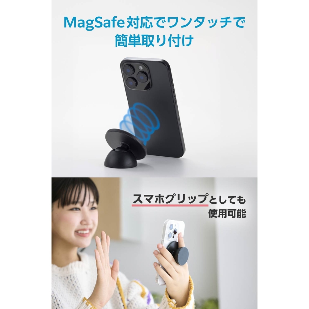 ■磁石が付く場所などにスマートフォンを簡単に固定可能。すぐに撮影できて、使用後の取り外しもスムーズです。 ■両手が自由になるため、撮影も思いのまま。自撮りはもちろん、ダンス動画や全身を写した写真撮影、さまざまなポーズでの撮影にもぴったりです。 ■くっつけたままでも違和感なく、スマホグリップとしても使えます。 ■簡単な角度調整で使いやすい向きに合わせられるため、撮影の幅が広がります。 ■マグネット固定できるキッチンに使用可能。レシピ動画を見ながら調理できます。 ■※コンロ周辺など高温になる場所では使用しないでください。 ■横向きに置いて、動画視聴用のスマホスタンドとして快適に楽しめます。 ■接着面は、壁や端末を傷つけにくい柔らかいシリコン製です。 ■MagSafe対応スマートフォンの背面に、マグネットで簡単に着脱できます。 ■MagSafe対応スマホケースや付属のメタルプレートと併用することで、MagSafe非対応のスマートフォンでも使用可能です。 ■※ケースの材質、厚みなどによって対応できない場合がありますのでご了承ください。 ■自社環境認定基準を1つ以上満たし、『THINK ECOLOGY』マークを表示した製品です。 ■環境への負荷軽減のため、輸送効率を高める設計の外装箱を使用した製品です。