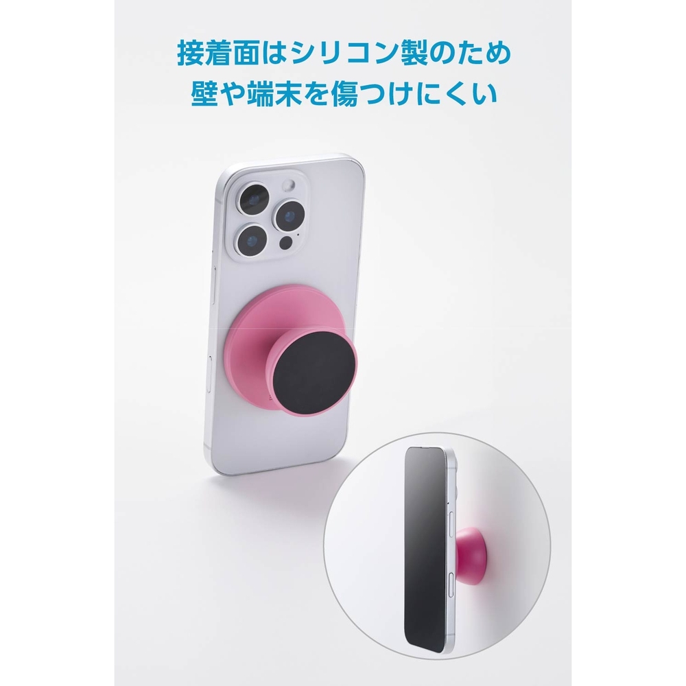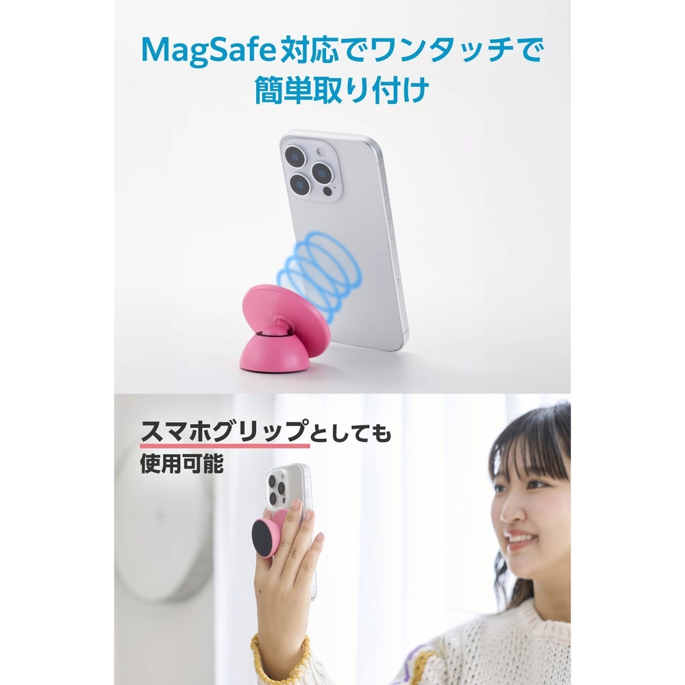 ■磁石が付く場所などにスマートフォンを簡単に固定可能。すぐに撮影できて、使用後の取り外しもスムーズです。 ■両手が自由になるため、撮影も思いのまま。自撮りはもちろん、ダンス動画や全身を写した写真撮影、さまざまなポーズでの撮影にもぴったりです。 ■くっつけたままでも違和感なく、スマホグリップとしても使えます。 ■簡単な角度調整で使いやすい向きに合わせられるため、撮影の幅が広がります。 ■マグネット固定できるキッチンに使用可能。レシピ動画を見ながら調理できます。 ■※コンロ周辺など高温になる場所では使用しないでください。 ■横向きに置いて、動画視聴用のスマホスタンドとして快適に楽しめます。 ■接着面は、壁や端末を傷つけにくい柔らかいシリコン製です。 ■MagSafe対応スマートフォンの背面に、マグネットで簡単に着脱できます。 ■MagSafe対応スマホケースや付属のメタルプレートと併用することで、MagSafe非対応のスマートフォンでも使用可能です。 ■※ケースの材質、厚みなどによって対応できない場合がありますのでご了承ください。 ■自社環境認定基準を1つ以上満たし、『THINK ECOLOGY』マークを表示した製品です。 ■環境への負荷軽減のため、輸送効率を高める設計の外装箱を使用した製品です。