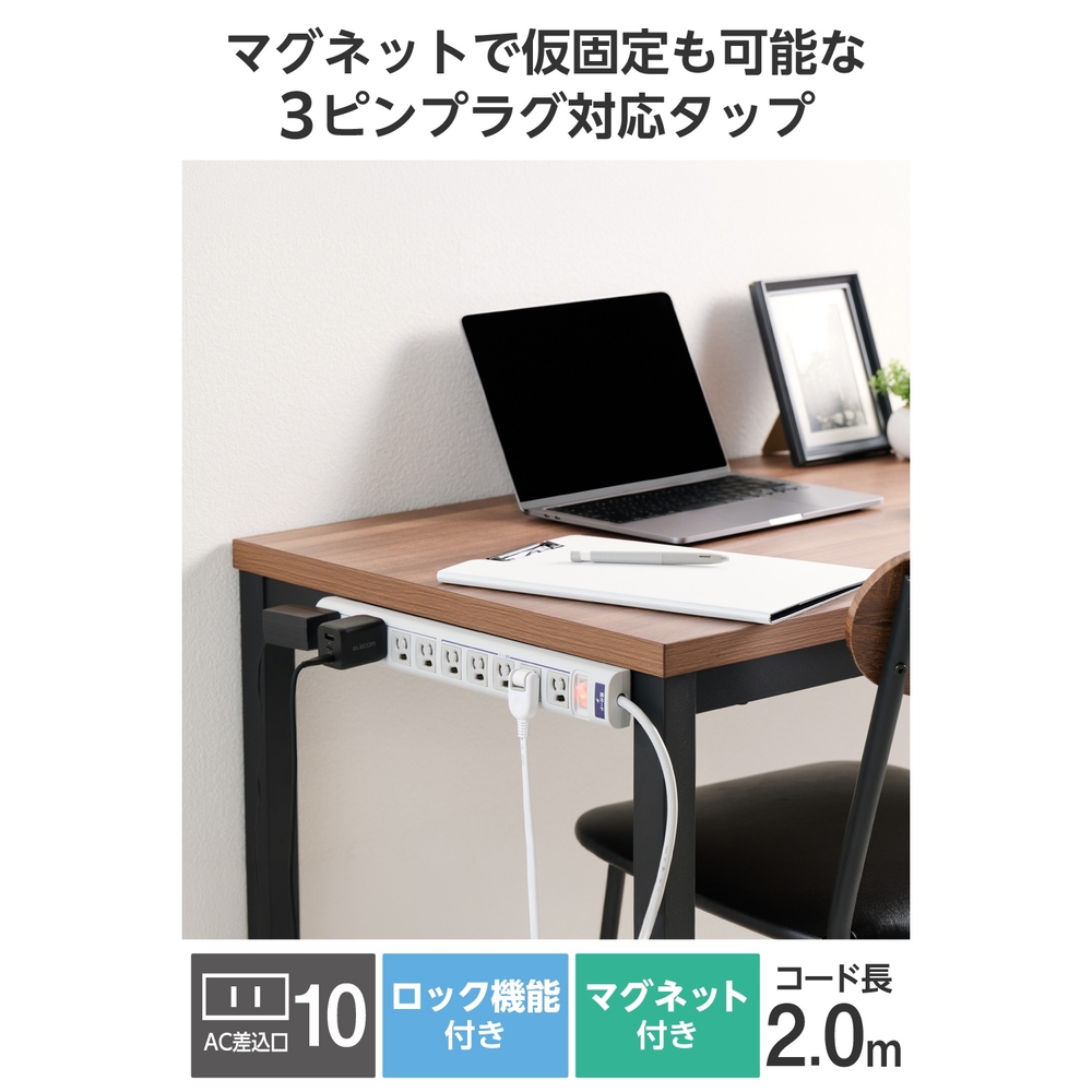 エレコム 電源タップ 3ピン 10個口 2m マグネット 雷ガード 抜け止め コード側5口一括スイッチ オフィス 会議室 ライトグレー T-T05-31020LGRS