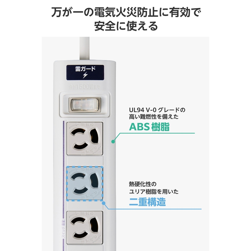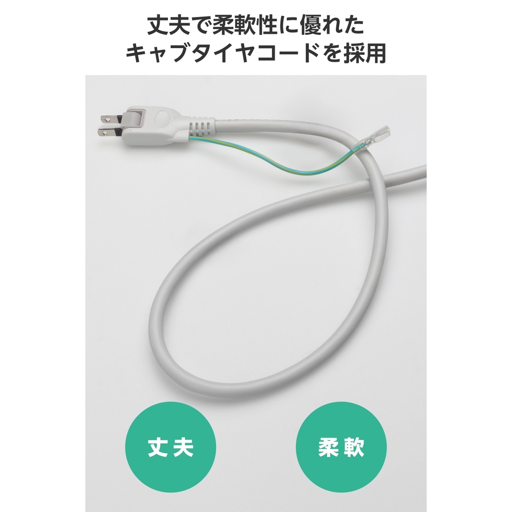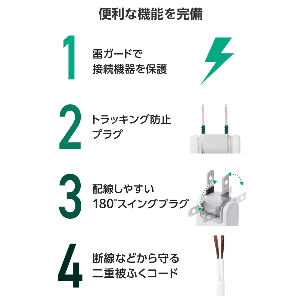 ■狭い場所でも配線しやすい180度スイング可能な2ピンプラグ(アース線付き)を採用しています。 ■10口ある3ピン対応の差込口には抜け止め機能を備えており、プラグを差込口に挿入した状態から少しひねるだけで、簡単にロックと解除の切り替えができます。ロックすることでプラグの意図せぬ抜け落ちを防止できます。 ■差込口の間隔は中心間で35mmです。 ■電源状態が一目でわかる点灯式一括スイッチを備えています。10口のうちコード側の5口はスイッチによるON/OFFができ、残り5口は常時通電するので、使用機器に合わせた差込口の使い分けが可能です。 ■本体裏面のマグネットにより、スチール製の机などに仮固定できます。 ■サージ電流耐量3500A/1回、2500A/2回、制限電圧775Vmax(25A 8/20μs)の素子(バリスタ)を搭載しており、誘導雷による雷サージを吸収して接続機器を保護します。 ■※直撃雷や、誘導雷であっても素子の許容値を超える雷サージが発生した場合、接続機器を保護できない場合があります。また、受けた電圧や回数により性能は劣化します。 ■電源コードには、PVCの絶縁体とシース(外皮)で構成され、通電したまま移動させることができる、丈夫で柔軟性に優れたキャブタイヤコードを採用しています。 ■本体筐体にはUL94 V-0グレードの高い難燃性を備えたABS樹脂、差込口周りには熱硬化性のユリア樹脂を用いた構造で、万が一の電気火災防止に有効です。 ■プラグには感電の危険を抑制する絶縁キャップを装備しています。 ■EUの「RoHS指令(電気・電子機器に対する特定有害物質の使用制限)」に準拠(10物質)した、環境にやさしい製品です。 ■環境に配慮し、ゴミを減らせて開梱作業もスムーズな簡易パッケージ仕様です。 ■自社環境認定基準を1つ以上満たし、『THINK ECOLOGY』マークを表示した製品です。 ■環境保全に取り組み、製品の包装容器におけるプラスチック重量を、社内基準製品より20%以上削減した製品です。 ■環境保全に取り組み、製品の包装容器が紙・ダンボール・ポリ袋のみで構成されている製品です。