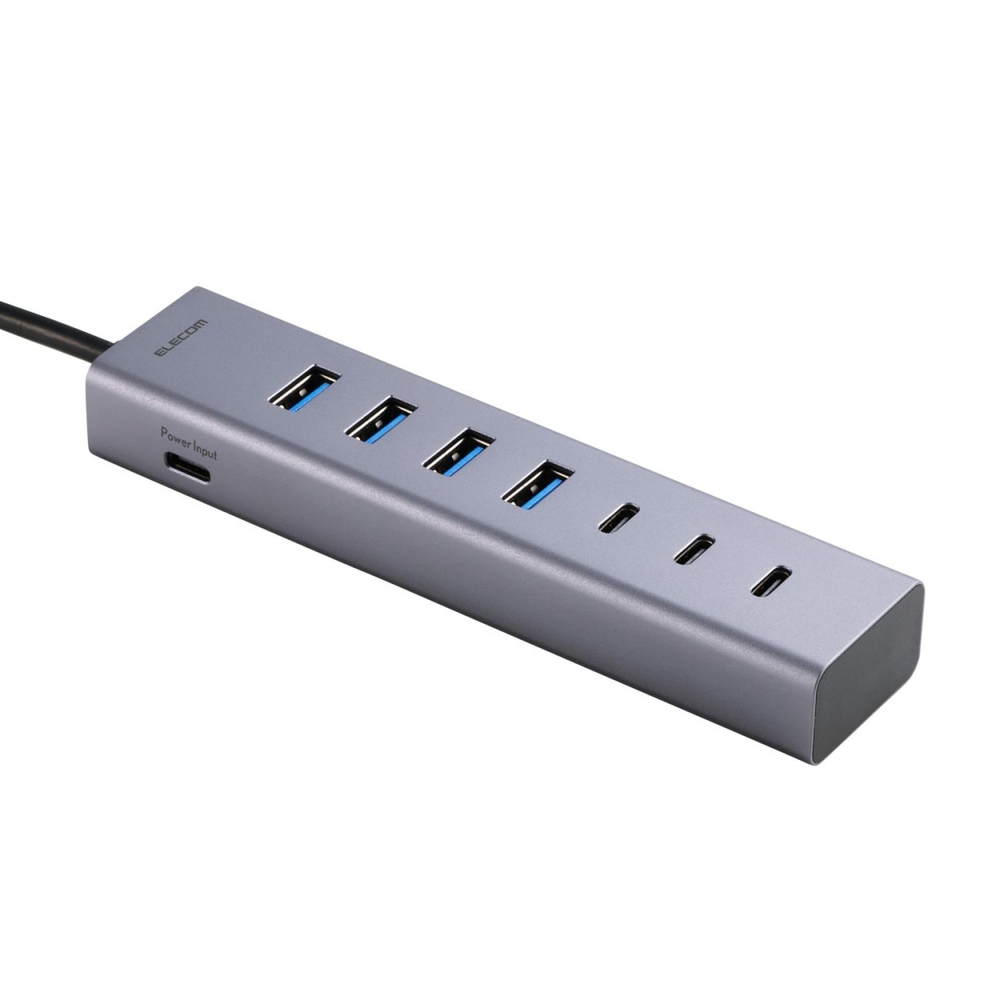 ■USB-Aポート×4、USB Type-C(TM)ポート×3を搭載。マウスやキーボード、USBメモリなどをこの1台にまとめて接続できます。 ■USB-AプラグをUSB Type-Cプラグに変換するアダプター付きで、さまざまな機器に接続可能です。 ■USB 5Gbps(USB3.2(Gen1))対応によりHi-Speed USB(USB2.0)の約10倍の速度で、書類・写真などの大容量データの転送ができます。 ※理論値 ■※USB 5Gbpsでご使用になるには、機器側がUSB 5Gbps対応である必要があります。 ■接続デバイス間で生じやすい相性問題を最小限に抑え、スムーズな操作体験を提供。送受信信号の認証試験にもとづく計測のもと、パソコンとUSBハブ間で通信するデータ品質を安定させる設計です。 ■USBハブ本体への給電専用USB Type-Cポート×1を搭載。手持ちのAC充電器を接続することで、セルフパワーUSBハブとして使用できます。 ■※パソコンへの充電はできません。 ■※給電用ケーブル、充電器は付属していません。 ■※AC充電器は出力15Wの製品をおすすめします。また、消費電力が大きいUSB機器を接続した場合は、電力不足により動作が不安定になることがあります。 ■安定した電源供給が可能なセルフパワー・バスパワー共用タイプです。 ■ケーブルは紛失の心配がない直付けタイプ。ケーブル長は約26cmで、取り回しやすい余裕のある長さです。 ■放熱性と耐ノイズ性に優れ、高級感のあるアルミ筐体を使用しています。 ■※本製品はUSBポートを増設するための製品です。本製品を使用してスマートフォン・タブレットを充電することはおすすめできません。 ■※法人で導入を検討されている方は、ご購入前に使用機器との検証を推奨しています。 ■※USB Type-C and USB-C are trademarks of USB Implementers Forum. ■自社環境認定基準を1つ以上満たし、『THINK ECOLOGY』マークを表示した製品です。 ■環境への負荷軽減のため、輸送効率を高める設計の外装箱を使用した製品です。 ■環境保全に取り組み、製品の包装容器が紙・ダンボール・ポリ袋のみで構成されている製品です。