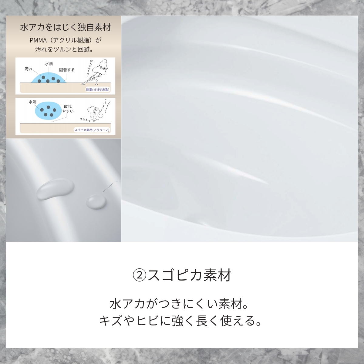 水アカがつきにくい「スゴピカ素材」により、
