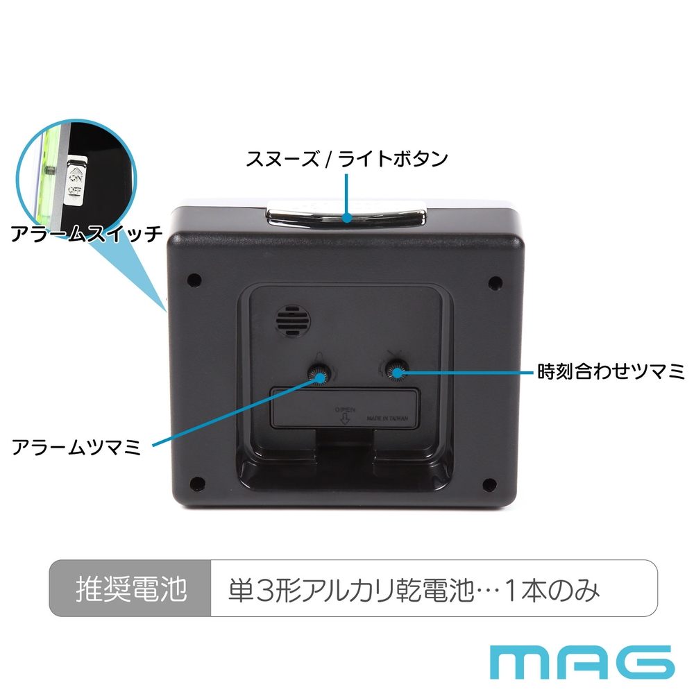 ●ロングセラーの目覚まし時計。誰にでもなじみがあり分かりやすい普遍的なデザイン。
