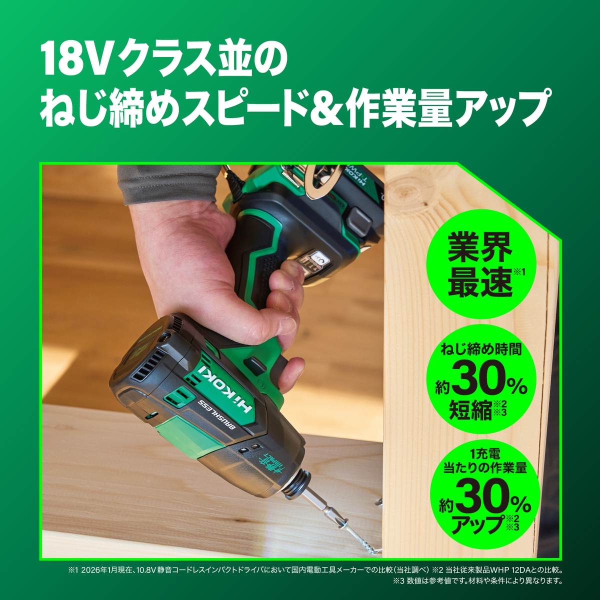 ●10.8Vタブレス電池を採用し、当社従来製品 10.8V静音インパクトドライバーWHP12DAから作業量が約130%に向上。 (Φ5.4×90mm/ラワン材/下穴なし)
