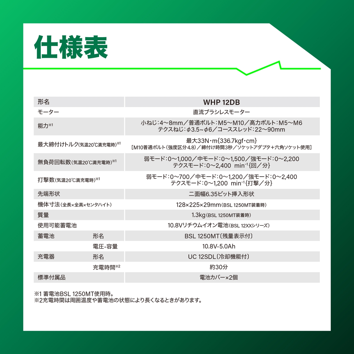 ●標準付属品:10.8Vタブレス電池(BSL1250MT)×2個、充電器(UC12SDL)、ケース、電池カバー