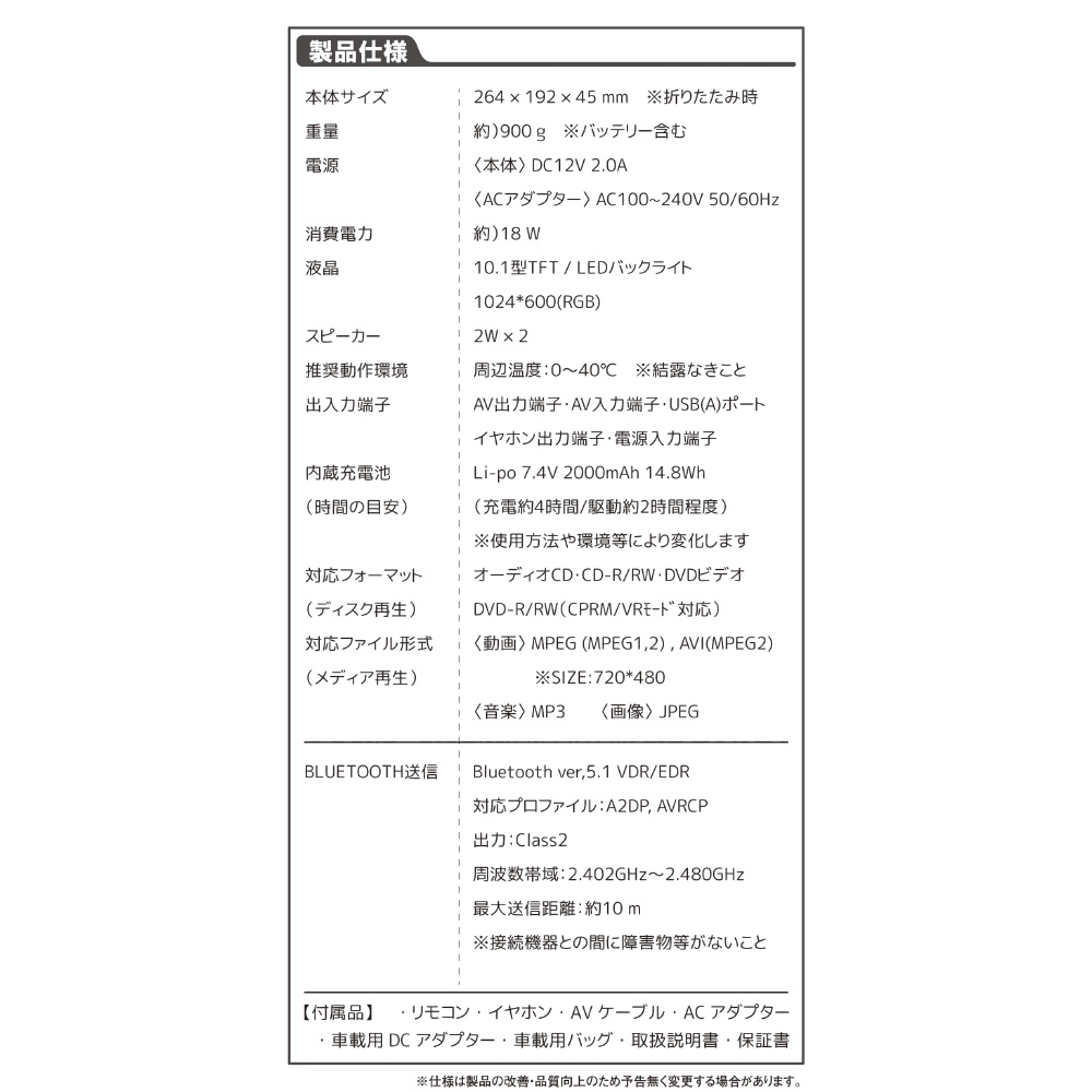 本体, リモコン, イヤホン, AVケーブル, ACアダプター, 車載用DCシガーアダプター, 車載用バッグ, 取扱説明書, 保証書